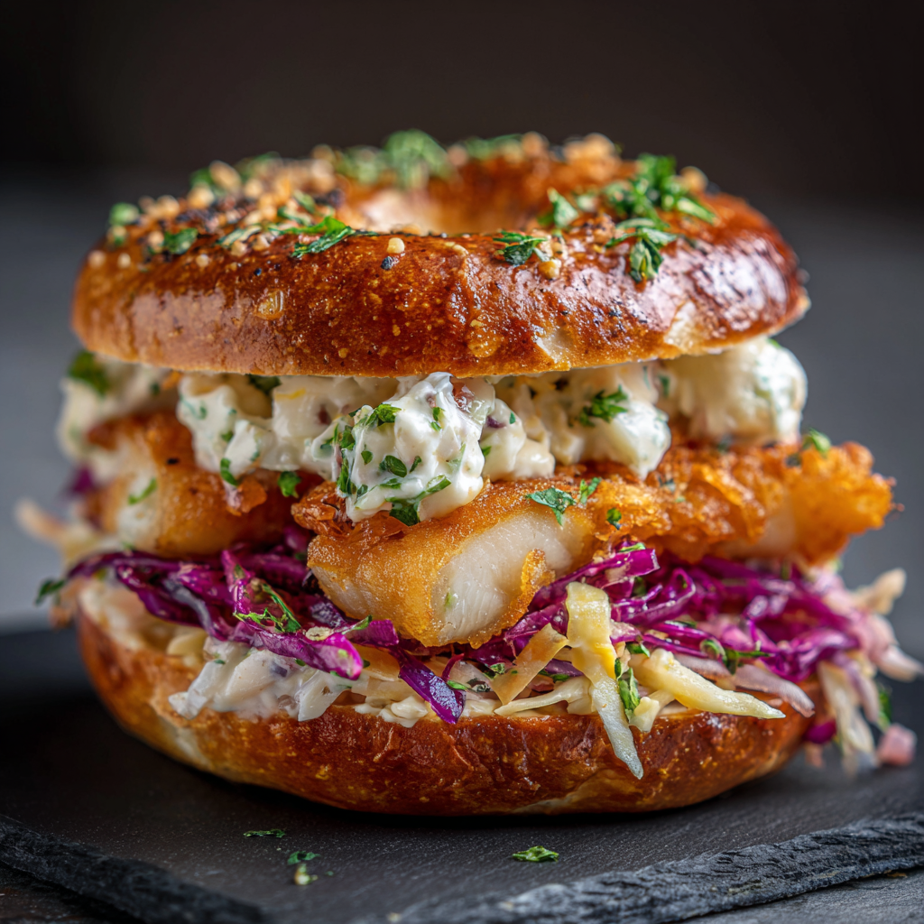 Crispy Cod Fillet, Herb & Garlic Cream Cheese, Cheddar, Coleslaw, Crunchy Fried Onions, Aioli Sauce.