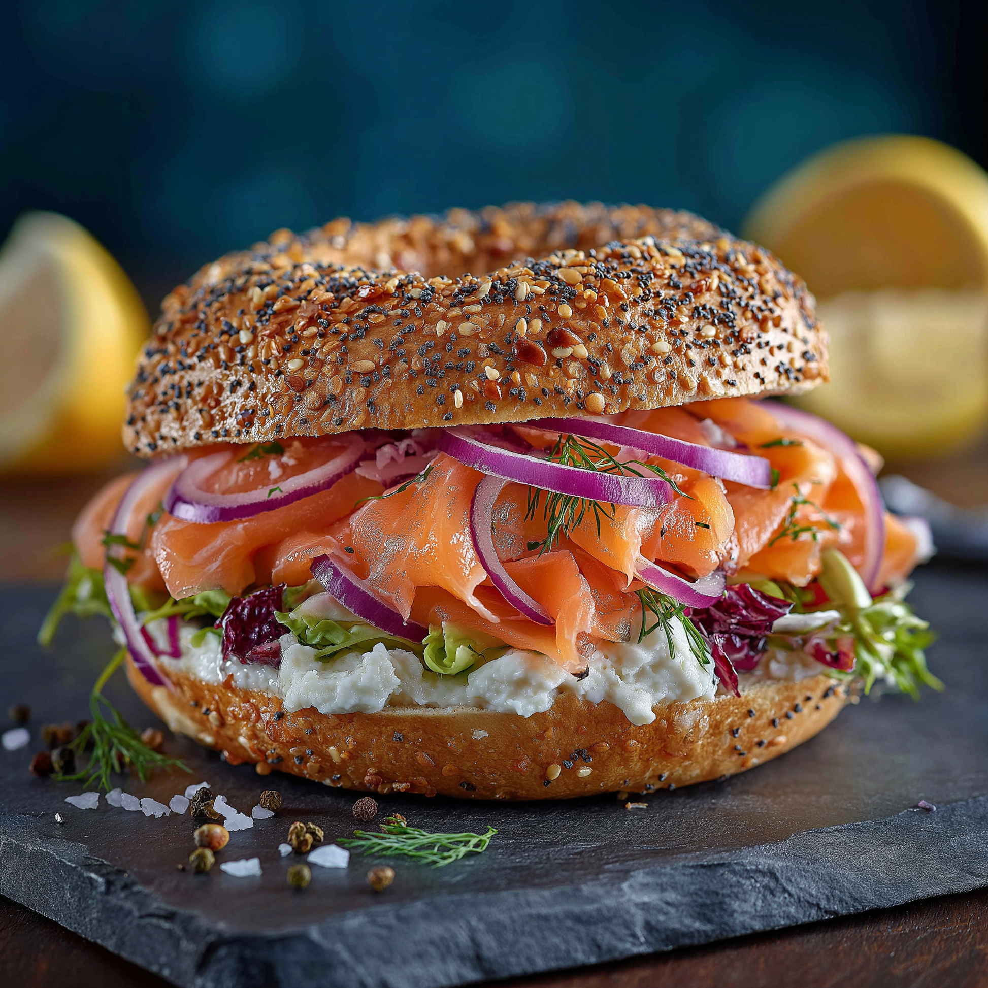 Smoked salmon, Cream cheese, Lettuce, Red onion, Lemon Dill Sauce.